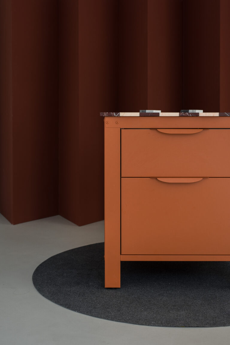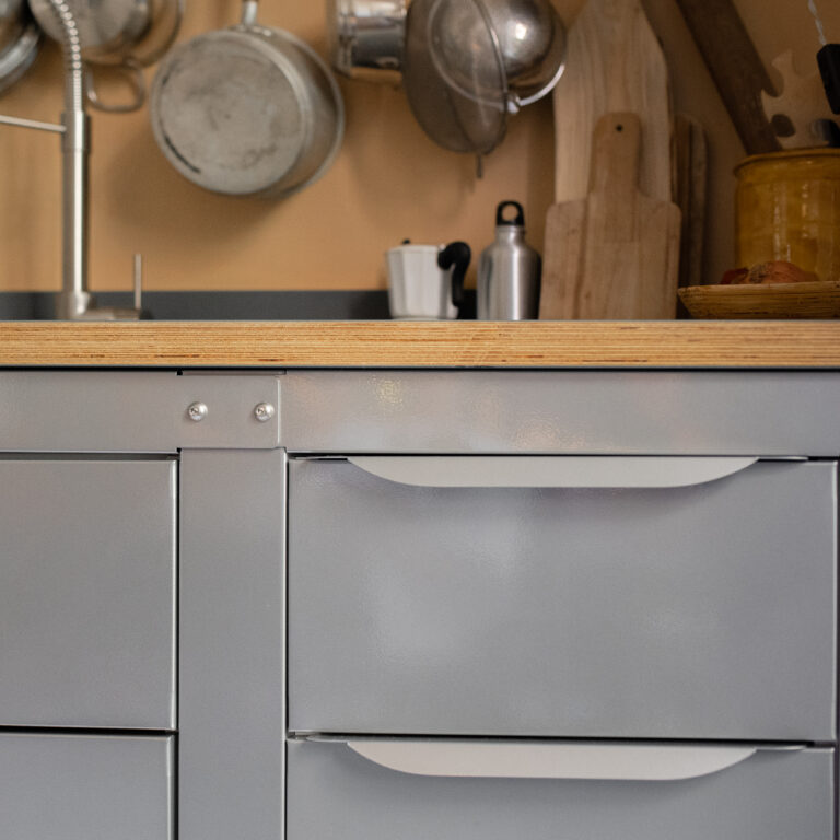 Box cassettiera larga (80 cm x 65 cm), frontalini in acciaio inox con maniglia. Un cassettone con altezza 40 cm per pentole e un cassetto con altezza 25cm per utensili. Possibilità di aggiungere un cassetto interno extra per le posate.